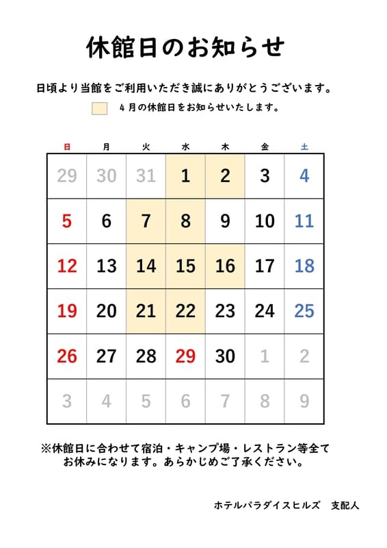 平素よりあだたら温泉ホテルパラダイスヒルズをご利用頂き、ありがとうございます。
