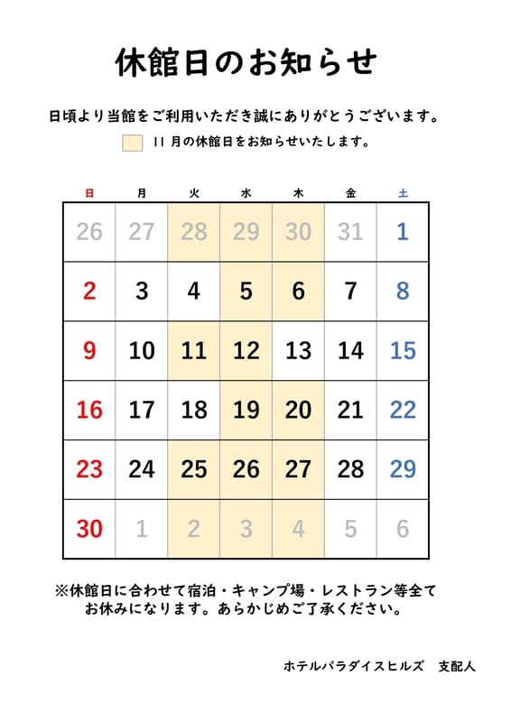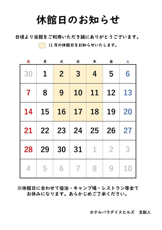 それに伴い【休館日前日のご宿泊について】のご案内をいたします。